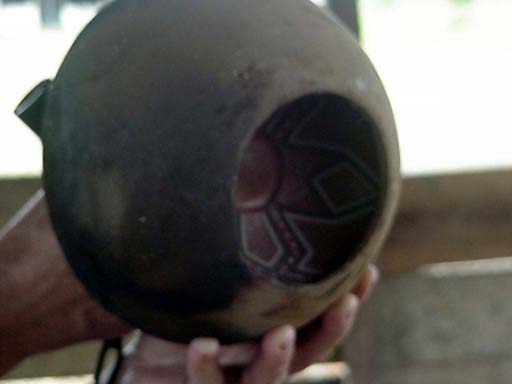 A potter holds the unfired mucahua in it's firing bowl, showing the open bottom of the firing bowl. The opening in the bottom of the firing bowl permits the heat of the fire and coals to quickly heat the mucahua.