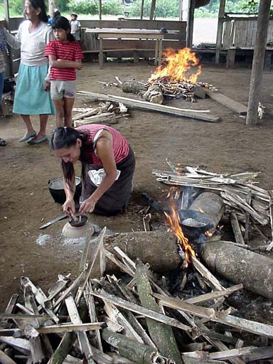 Several firings are going on simultaneously in the community building in Nueva Vida. Another mucahua is being fired in the foreground, and a group of smaller mucahuas are being fired at the back.