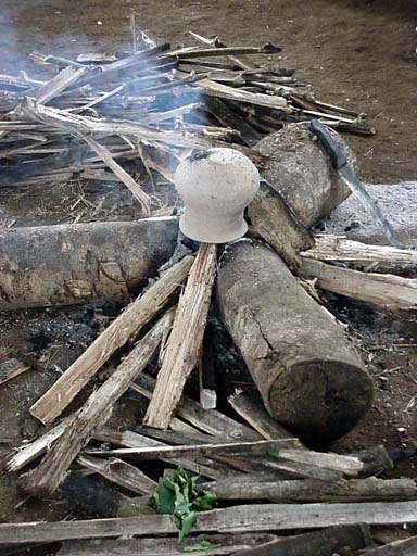 The cooking pot being heated and smoked to seal the interior. The leaves used to rub the inside are in the foreground.