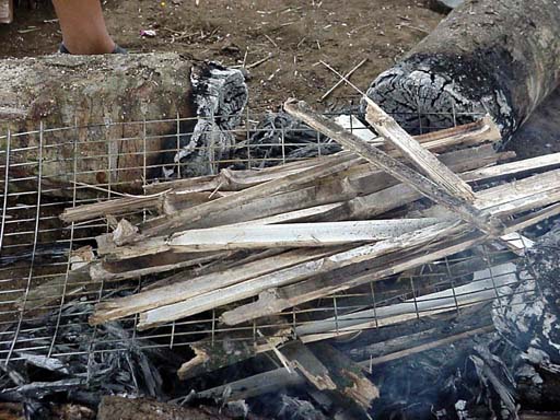 The mucahuas at the start of the firing. Split dry bamboo is placed on the metal grid. The bamboo burns with a quick hot fire.