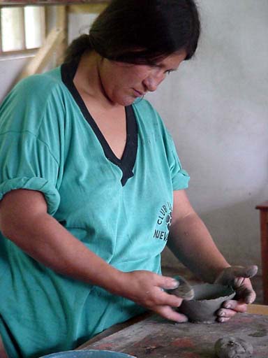 in Nueva Vida smooths and shapes a mucahua after coiling the initial shape.
