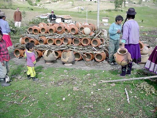 Broken pots from previous firings are placed around the side of the firing stack where the fire will be started. The broken pots help to control the firing and hold in the heat for the first layer of pots.