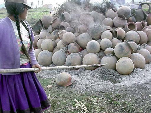 As the firing is completed on one end of the stack, flames still race through the pots on the other end. One of the potters uses a metal shovel wired to a long pole to move a few coals and ashes onto the pots to slow their cooling.