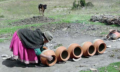 The largest jars (ollas) are placed in the first layer of the firing stack. Stability is critical as more layers will be added and and the unfired pots are fragile.