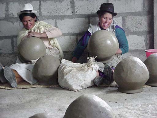 The potters do a final smoothing of the surface using the wet clay mallets. The mallets are slid over the surface of the clay in a circular motion, removing the bumps and dents left from the pounding.