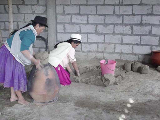 The clay is divided into large cylindrical chunks after mixing. One of these is placed on top of the inverted large pot. The potter will form the top of a new pot first.