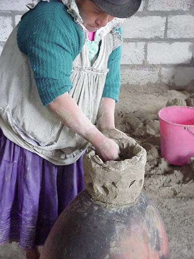The potter begins the new pot by punching her hand down into the clay chunk, and then pulling clay up from the inside to form a thick hollow shape.