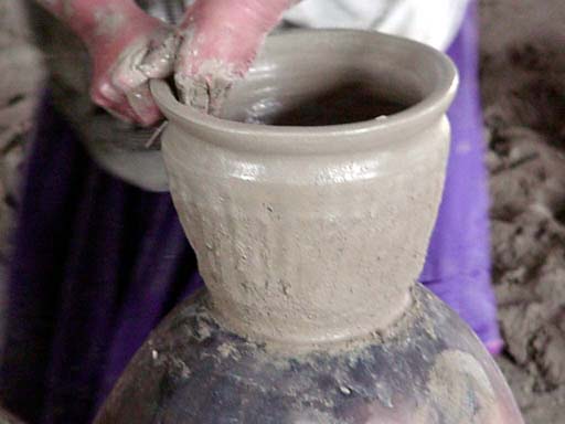 a piece of wet shoe leather. The potter holds her hands in the shape of