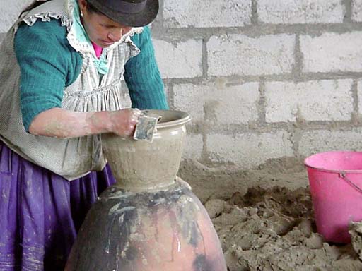 The rim is almost complete. The potter puts finishing touches and details to the edge with the thick piece of wet shoe leather. The bottom of the pot is left thick until the rim is stiff enough to hold its shape.
