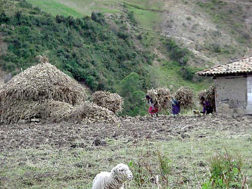 Women in Jatumpamba carry bundles of corn stalks on their backs to add to the stack on the left. In much the same way, they carry bundles of brush and firewood for the pottery firings down from the mountaintops high above Jatumpamba.