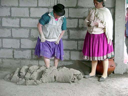 The potter works through the large roll of clay with her feet one or two more times to complete the mixing process. It is now ready to use to make pottery.