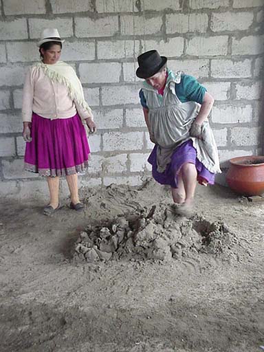 Using her feet, the potter moves around the pile, working from the outside to the inside, mixing the volcanic ash with the wet clay.
