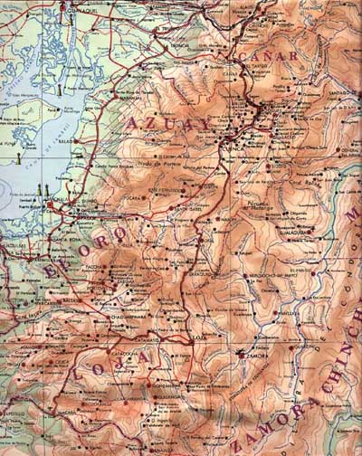 | Southern Ecuador has a rich pottery heritage, especially in the Andean regions of Cañar, Azuay, and Loja. Click on the map above to see a detail of the region which includes Jatumpamba and San Juan Bosco (Olleros), the two pottery villages featured here. |